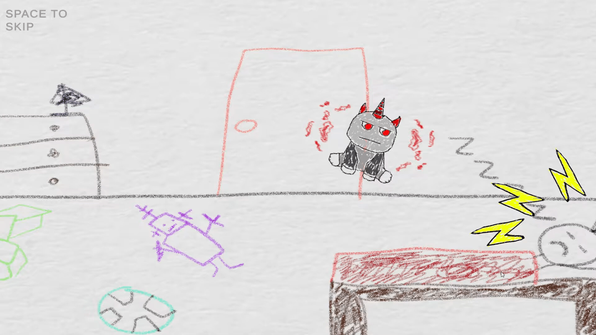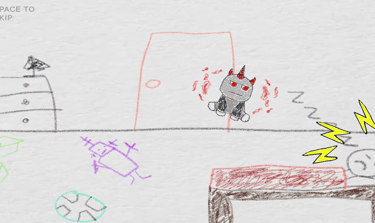For the story, we wanted it to be told in the eyes of a child, and wanted to make it enjoyable for younger audiences, so we decided on drawings for the visuals of the cut scenes and rhymes for the voices. This was to help show the user how to play the game while also telling the story of the game. making it very easy for users to understand and get players involved with the level a lot quicker.